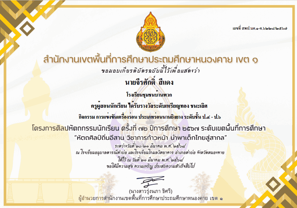ครูผู้สอนนักเรียน ได้รับรางวัลระดับเหรียญทอง ชนะเลิศ การแข่งขันเครื่องร่อน ประเภทร่อนนานยิงยาง ระดับชั้น ป.4 - ป.6