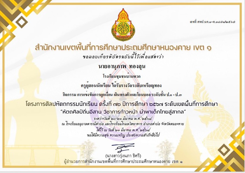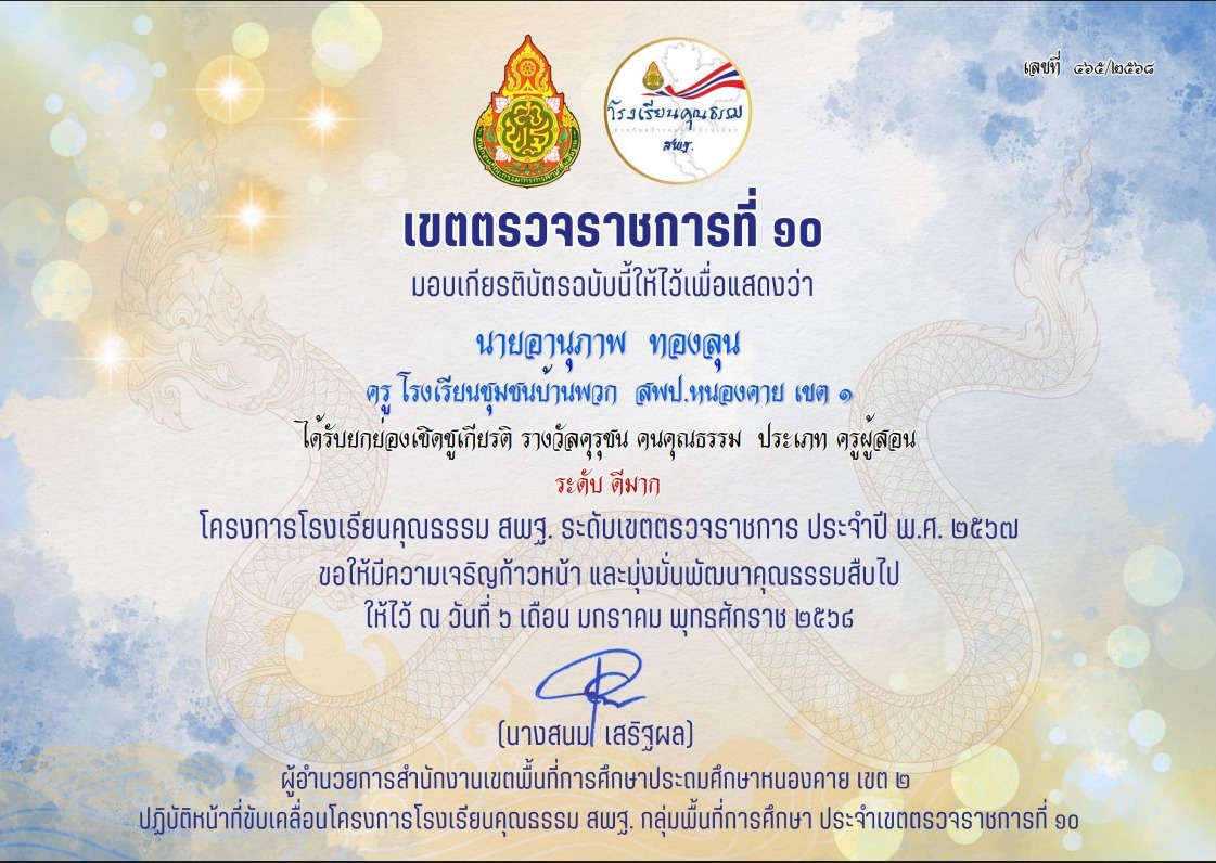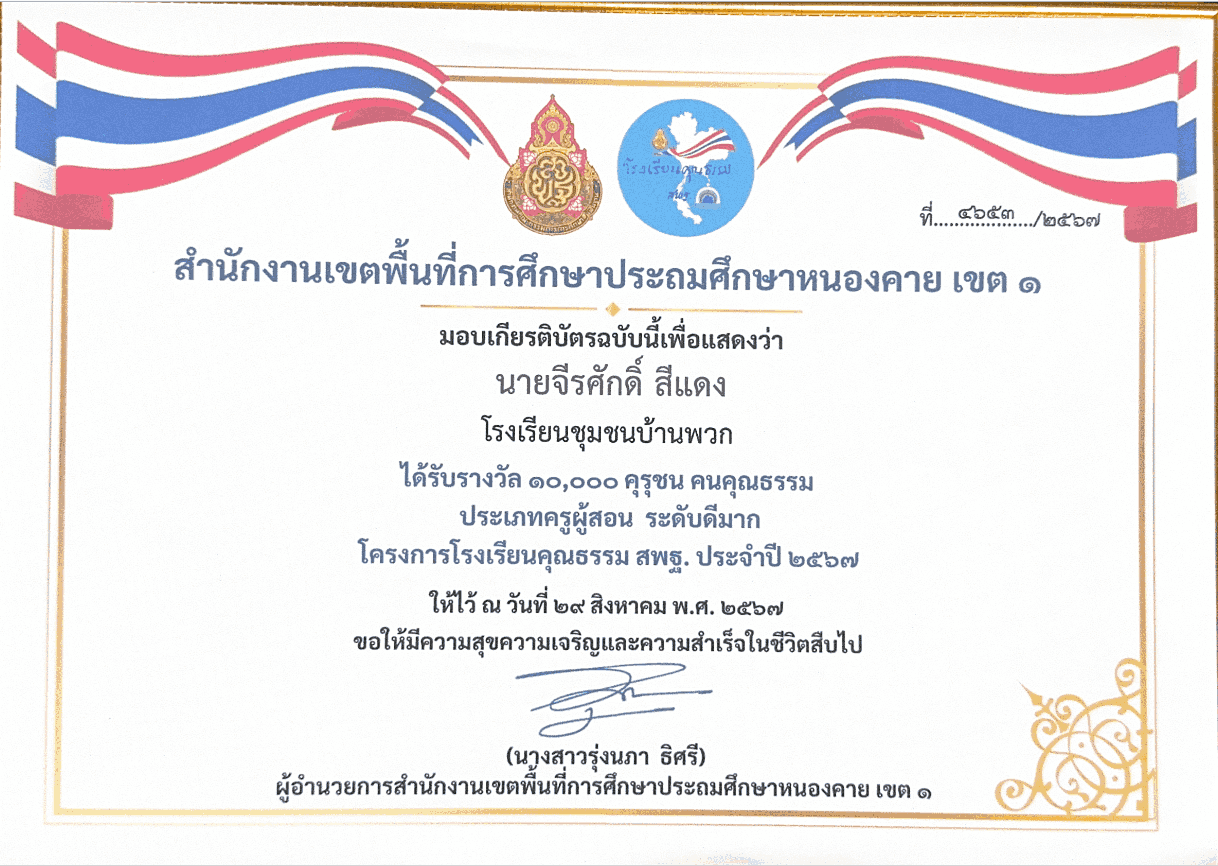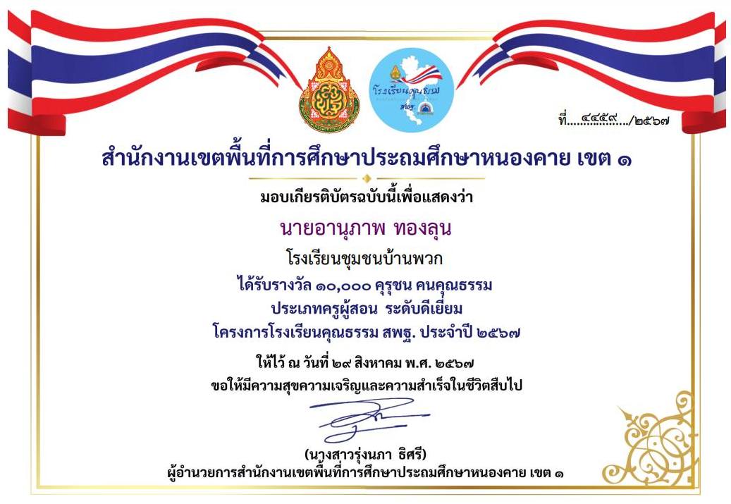 รางวัล ๑๐,๐๐๐ คุรุชนคนคุณธรรม ประเภทครูผู้สอน ระดับดีเยี่ยม จากสำนักงานเขตพื้นที่การศึกษาประถมศึกษาหนองคาย เขต ๑