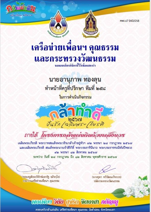 รางวัลที่ปรึกษาทีมจิตอาสากล้าทำดีปันรักเฉลิมพระเกียรติ จากเครือข่ายเพื่อนฯคุณธรรม และกระทรวงวัฒนธรรม