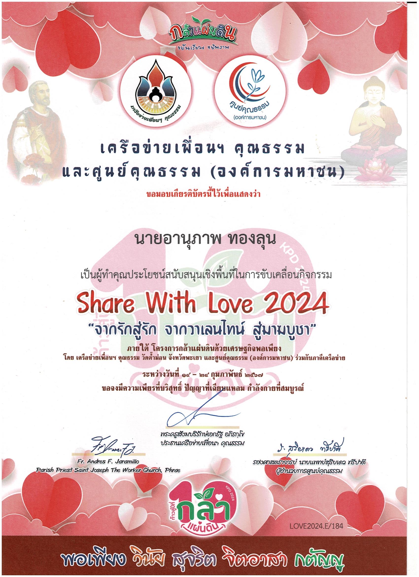 รางวัลผู้ทำคุณประโยชน์สนับสนุนเชิงพื้นที่ในการขับเคลื่อนกิจกรรม Share With Love 2024
