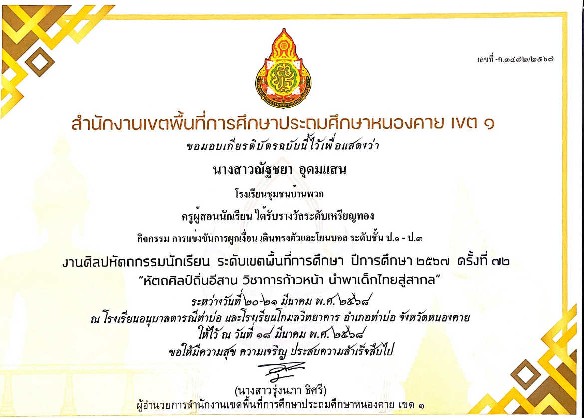 ครูผู้สอนนักเรียนได้รับรางวัลระดับเหรียญทอง กิจกรรมปั้นดินน้ำมัน ระดับปฐมวัย